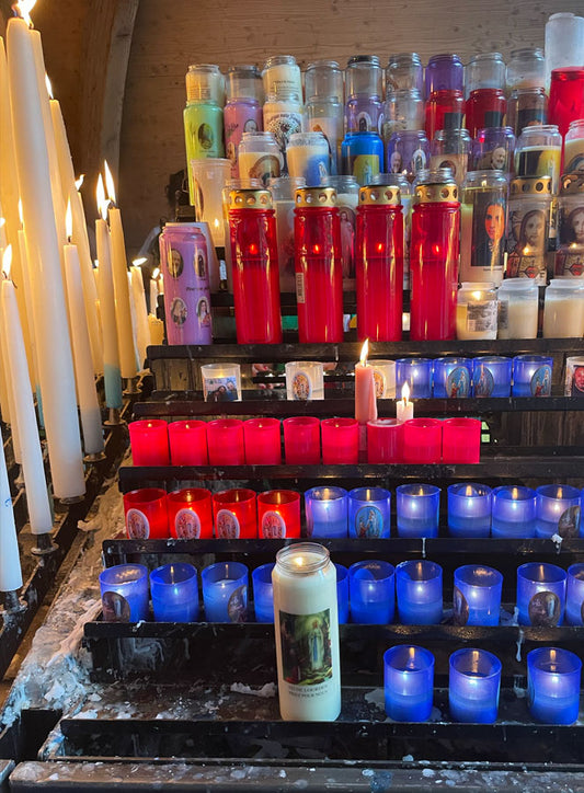 Lourdes Novena Candle with Sacred Image – Virgin Mary or Lourdes Grotto Apparition | Prayer Intention Video Service